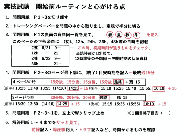 過去問は実際の試験時間に合わせ、午前中:1時間10分(専門)、午後:3時間(実技)翌日の分析・反省は2時間程度。
