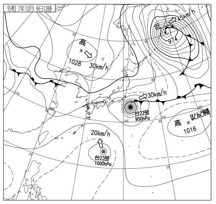 - 南西側の弱化: 23号の存在によって、22号の南西側では等圧線の間隔が相対的に広がる(気圧傾度が小さくなる)傾向が生じました。