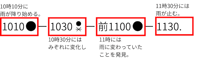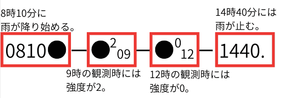 は大気現象の「雨」、小さな数字は現象の強さと時刻、大きな数字は時刻を表しています。