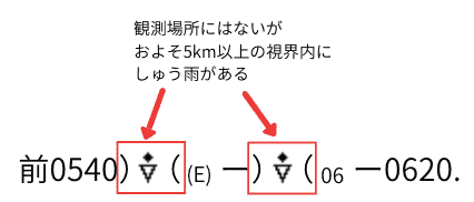 - 現象記号を囲む「()」は、観測場所にはないが、視界内(およそ5km未満)に現象があることを表します。