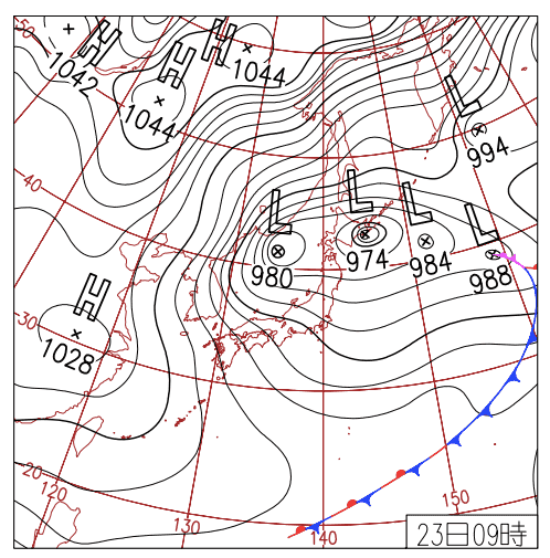 • 等圧線の屈曲: 日本海上で等圧線が高圧側へ向かって凸に曲がる。