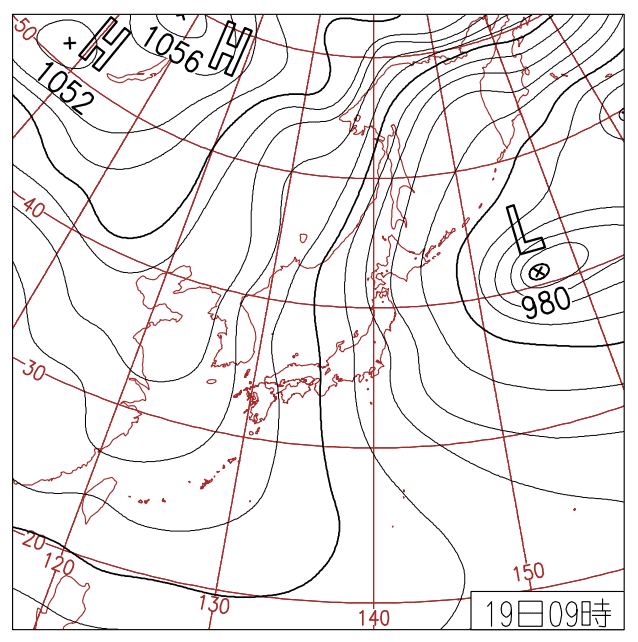 天気図では、日本海の等圧線が「く」の字に大きく湾曲したり、袋のようにたるんだりするのが特徴です。