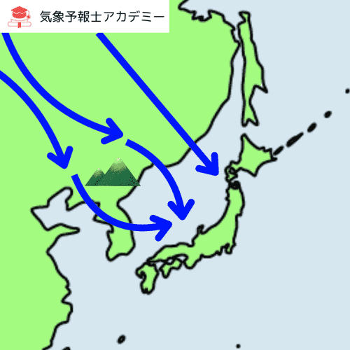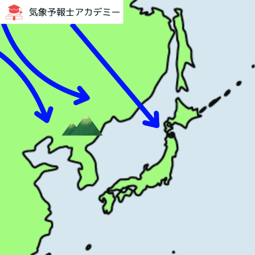 この冷たい風は、朝鮮半島にある高い山脈(長白山脈など)にぶつかって、いったん二つに分かれてしまいます。例えるなら、風が山を避けるように左右に分かれるイメージです。