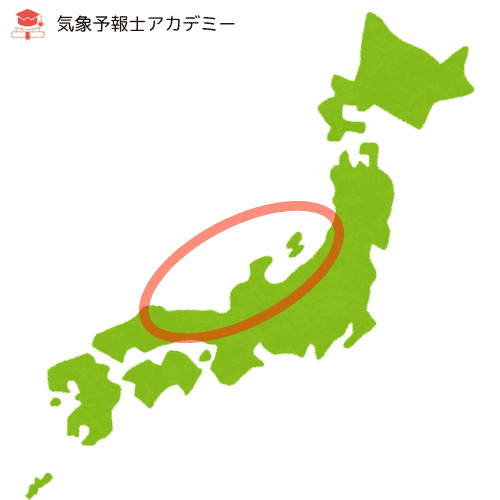JPCZの上陸地点は、気圧配置に対応して東西に移動するため、決まった位置というのはなく、東北南部から山陰までの広い範囲に影響を及ぼします。