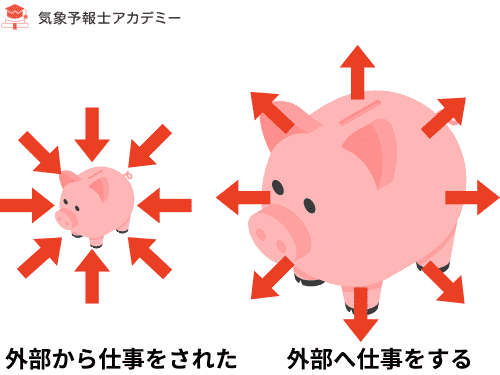 - 膨張して外へ押す → 気体は「外部へ仕事をする」