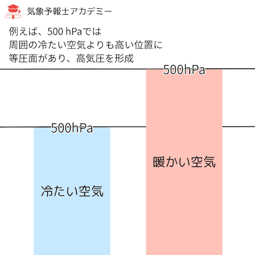 - 結果として、ある程度の高さ(例:500 hPa)では、周囲の冷たい空気よりも高い位置に等圧面があり、高気圧を形成します。(例:太平洋高気圧の上層)