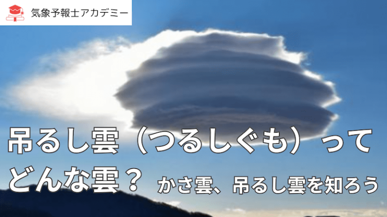 気象予報士アカデミー受講生のSさんより街中で見かけた「吊るし雲」の写真をいただきました。 ゴルフの打ちっぱなしの建物の上にUFOのように浮かんでいる雲。これは「吊るし雲」です。 住宅地に突如現れた吊るし雲。講師陣も驚いて … 続きを読む 吊るし雲の正体とは?不思議な形と仕組みを気象予報士が解説|空を楽しむ「生きた気象学」