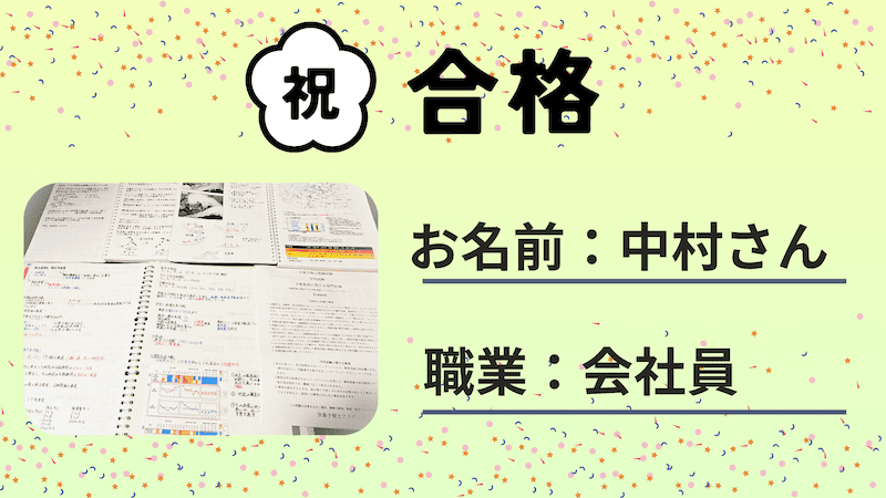 2024年10月から受講を開始された中村さん(会社員)から、2025年8月試験の合格体験記をいただきました。